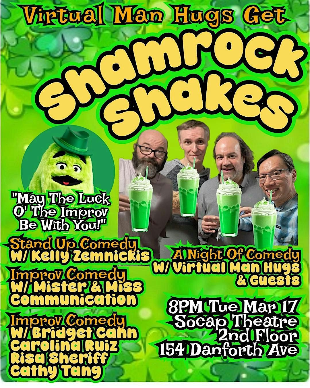 Celebrate St Patrick's Day with an evening of comedy and laughs at "Shamrock Shakes" presented by long running comedy troupe Virtual Man Hugs.