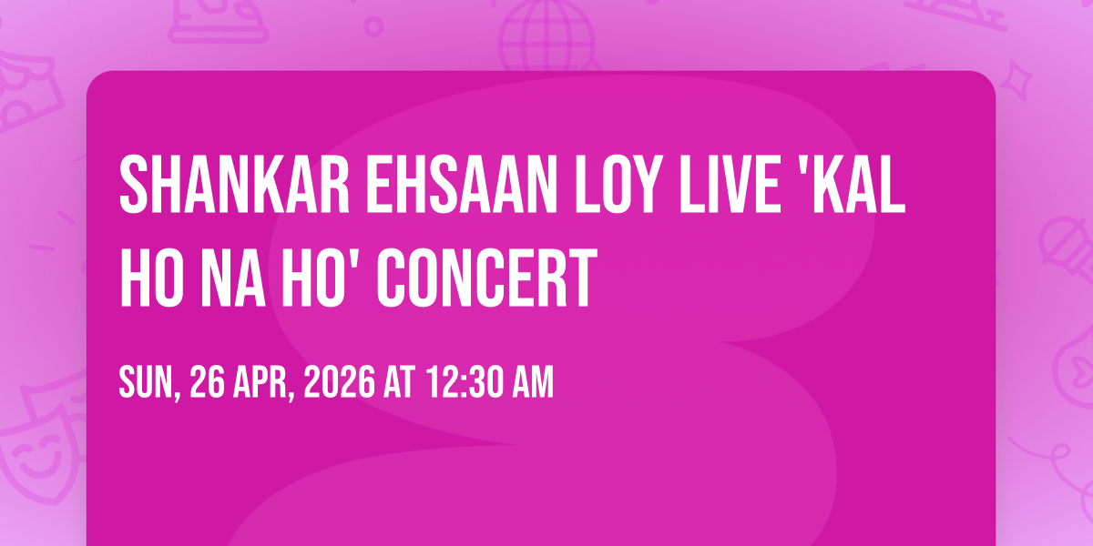 π Location: 39.0979, -94.5863π Be part of history at Shankar Ehsaan Loy Live 'KAL HO NA HO' Concert, an extraordinary gathering that will captivate your imagination! ποΈ The prestigious Municipal Auditorium - Kansas City in Kansas City, MO sets the stage for an unforgettable experience on April 26th, 2026 at 12:30 AM. β¨ They are bringing together the finest elements of entertainment and innovation to create moments that will take your breath away. From the moment you arrive, you'll be immersed in an atmosphere of wonder and excitement. π― This carefully planned event ensures every guest experiences something truly special. π Early booking is recommended for this must-attend event of the season!