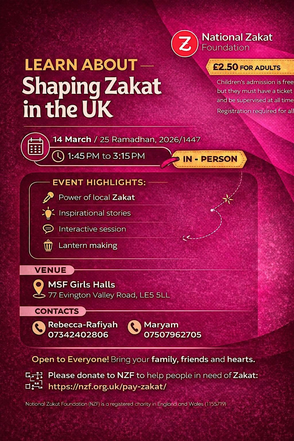 Come to a beautiful, inspiring event and learn about the power of Zakat and how local Zakat transforms the lives of people in Leicester and across the UK facing hardship.
