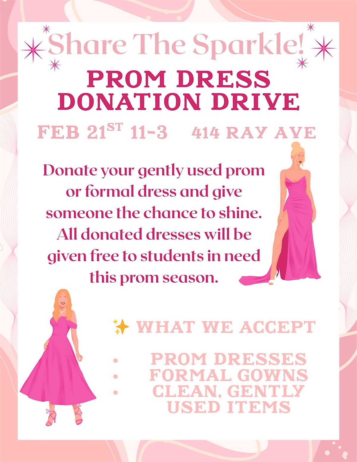 Share the Sparkle: Prom Dress Donation Drive is a community-centered initiative created to ensure that every student has the opportunity to attend prom with pride and joy—no matter their financial situation. We are inviting students, families, alumni, and generous community members to donate gently used prom gowns and formal dresses that are ready to shine once more. These dresses, once worn with love, can become the dream dress for a student who needs it most.