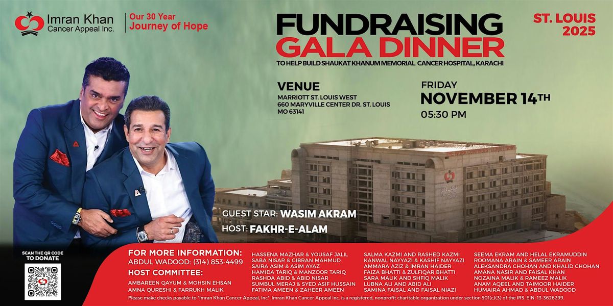 Join us at the Fundraising Gala Dinner in Saint Louis, USA in support of Shaukat Khanum Memorial Cancer Hospital and Research Centre, Karachi.