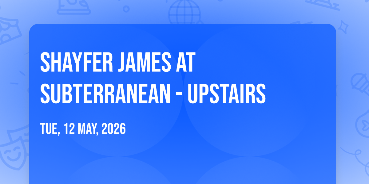 β¨ Enter a world of endless possibilities at Shayfer James at Subterranean - Upstairs, where every moment tells a story! ποΈ The stunning Subterranean - Upstairs in vibrant Chicago, IL transforms into a realm of wonder on May 12th, 2026 at 07:00 PM. π They have crafted an experience that goes beyond the ordinary, combining elements of surprise, delight, and pure entertainment. Every detail has been thoughtfully considered to ensure your journey with us is nothing short of extraordinary. π― Join fellow adventure seekers and memory makers in this celebration of imagination and innovation. π Reserve your spot today and be part of something truly special!