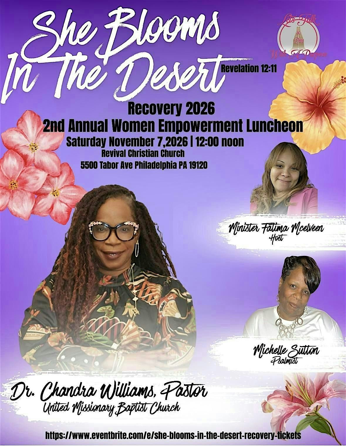 Welcome to She Blooms in The Desert "Recovery"! Join us at the Revival Christian Church on November 7, 2026 at 12:00 PM (Eastern Time) for a day of reflection, growth, and healing. This event is a safe space for women to come together, share their stories, and support one another on their journey to recovery. Let's bloom together amidst the challenges of life. If you missed last year, you do not want to miss this year. See you there!