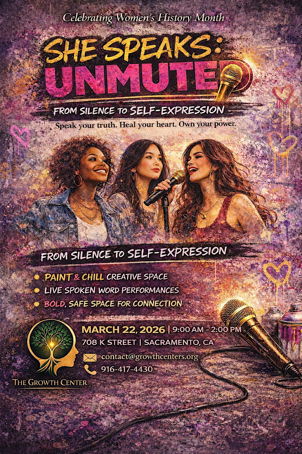 Join us for She Speaks: Unmuted, a lively in-person celebration of Women's History Month! Connect, share stories, and honor the incredible journeys of women everywhere. It’s all about empowerment, community, and unleashing your voice. Don’t miss this inspiring gathering where every voice counts! (Poetry, spoken words, rap, sing, etc)