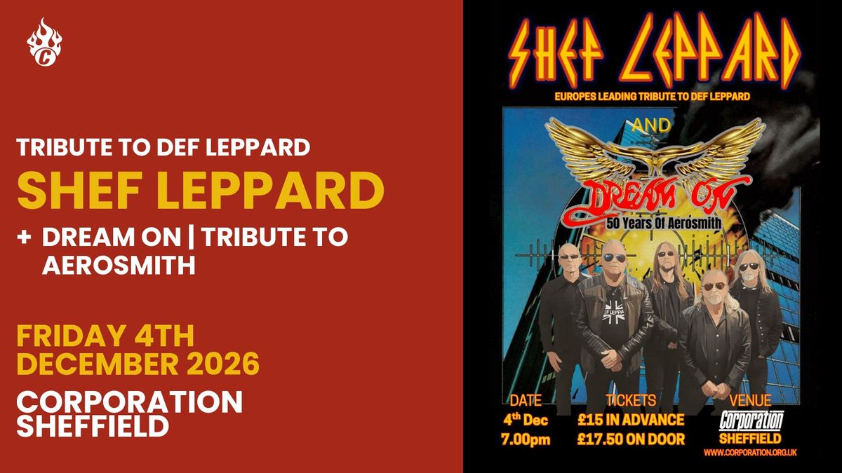 Def Leppard and Aerosmith are two of the biggest stadium rock bands in the world having sold over 170 million albums between them and they have racked up enormous chart success with singles like Pour some sugar on me, Walk this way, Animal and Love in an elevator.Shef Leppard features original Def Leppard drummer Tony Kenning and both bands comprise of musicians with a wealth of experience having toured all round the world with artists like Saxon, Wishbone Ash, FM, Tony Martin of Black Sabbath, Little Angels and Terrorvision. These bands can truly do justice to these big rock classics and leave you wanting more.