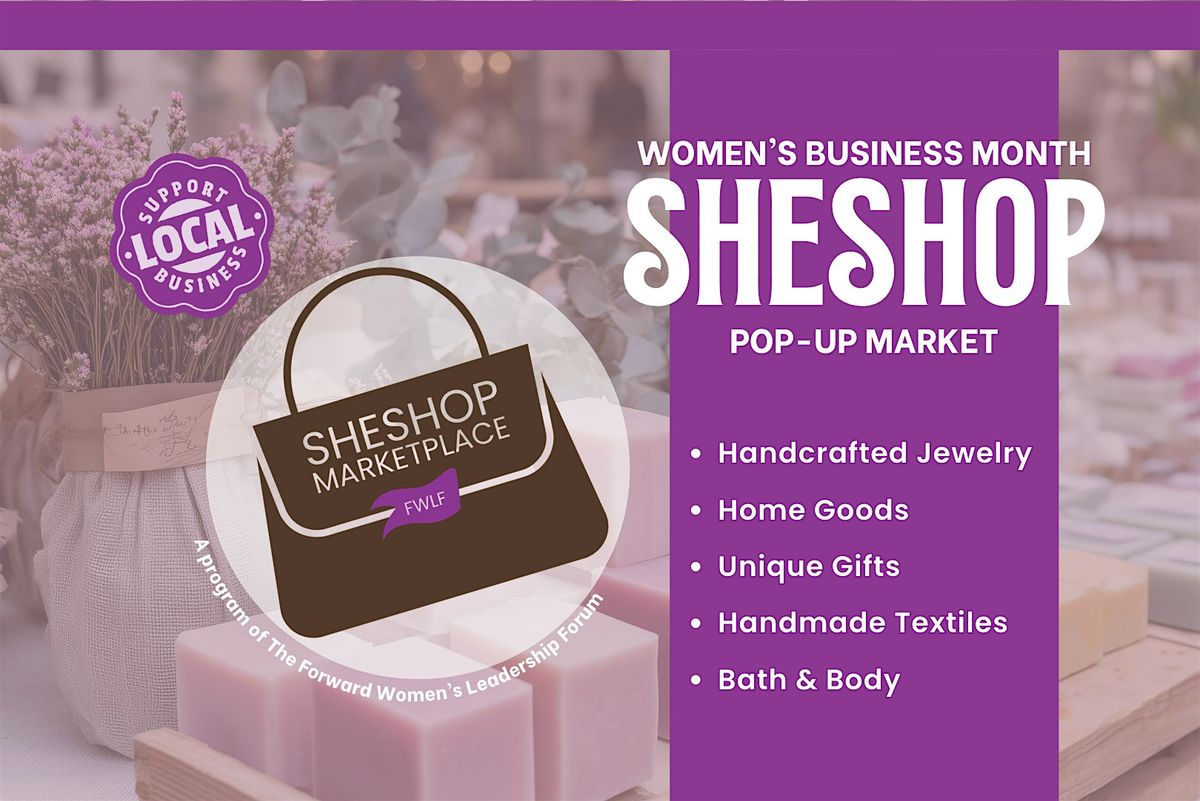 Celebrate Women's History Month and shop unique products at the SheShop pop-up marketplace. Sponsored by the Forward Women's Leadership Forum, the marketplace showcases makers, artisans, and entrepreneurs from the DMV, offering a range of unique products, including gift items, handmade jewelry, bath and body products, clothing, accessories, and more. Register for details about participating vendors, giveaways, and more!