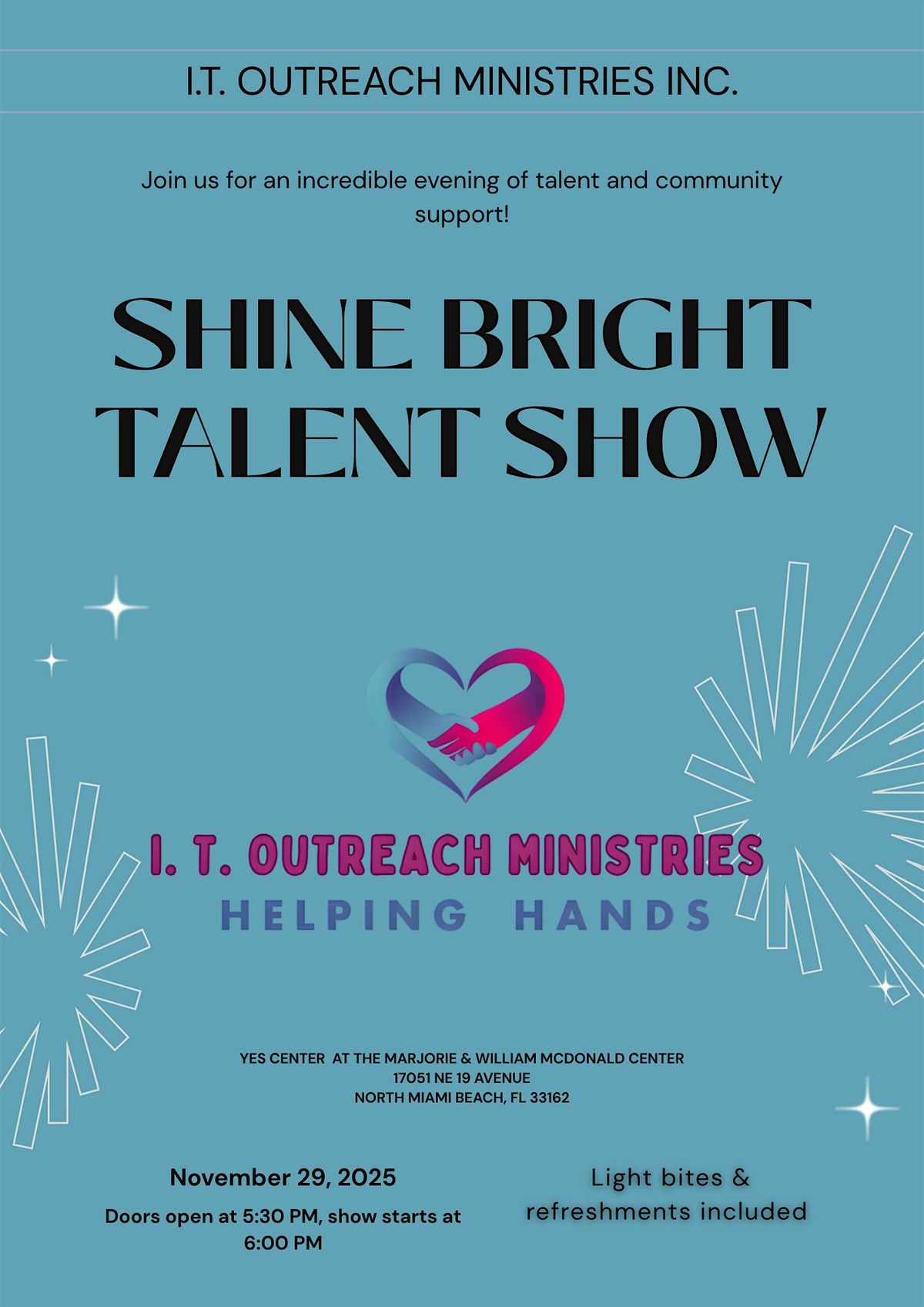EVENT DETAILS:Join us for an inspiring evening in support of I.T. Outreach Ministries Inc., celebrating multicultural community talent and raising funds for a vital cause.