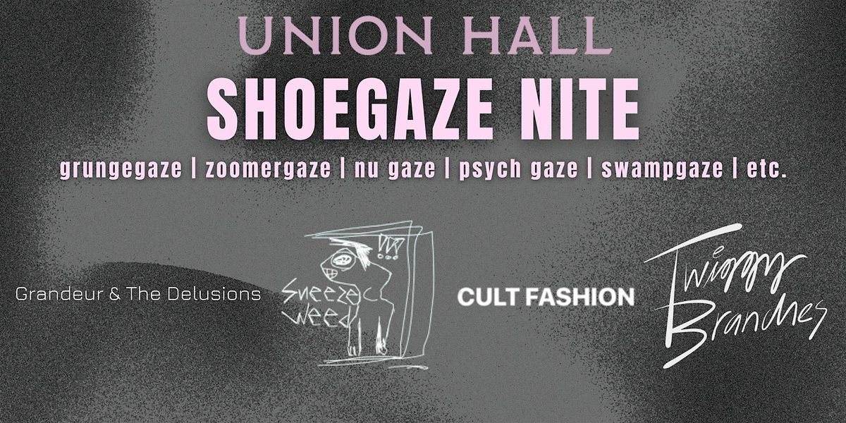Welcome to Shoegaze Nite! Get ready to immerse yourself in dreamy tunes with performances by Twiggy Branches, Cult Fashion, Sneezeweed, and Grandeur & The Delusions. Join us at Union Hall for a night filled with ethereal sounds and mesmerizing melodies. Don't miss out on this opportunity to experience the magic of shoegaze music live. Grab your friends and come vibe with us!