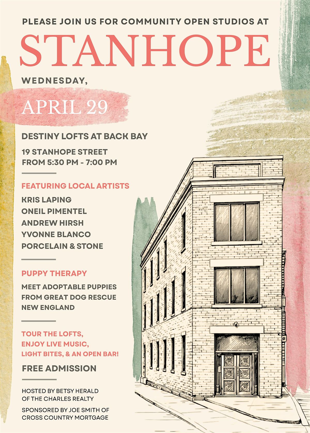 Join us on April 29th for a unique open‑house experience at 19 Stanhope Street. Each available condo will be transformed into a mini‑gallery and boutique, featuring local artists. Explore the homes, meet the creators, and get a feel for the community while enjoying an evening of art, music, and connection. Complimentary food and beverages will be served, making it the perfect way to unwind while discovering what life at Stanhope has to offer.