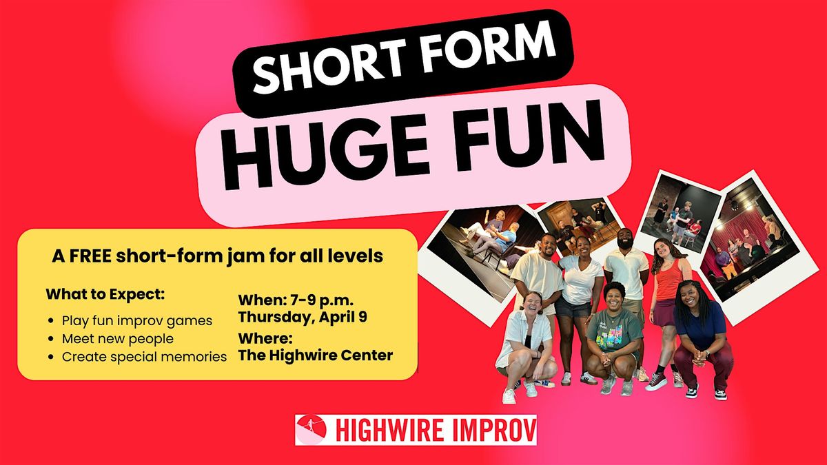 Join us for Short Form, Huge Fun, a community improv jam. We will combine everyone's favorite short form games with community building. Come enjoy snacks and silliness for FREE!