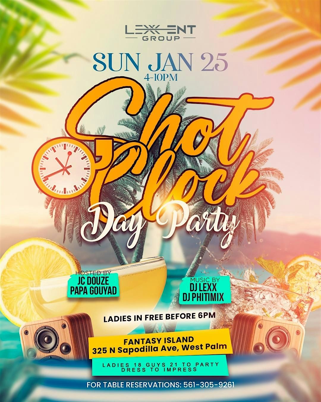 SHOT O'CLOCK - BEST DAY PARTY IS FLORIDA WITH A BLEND OF KOMPA, HIP-HOP, R&B, RABODAY, AFROBEATZ, DANCEHALL AND MORE.About this Event