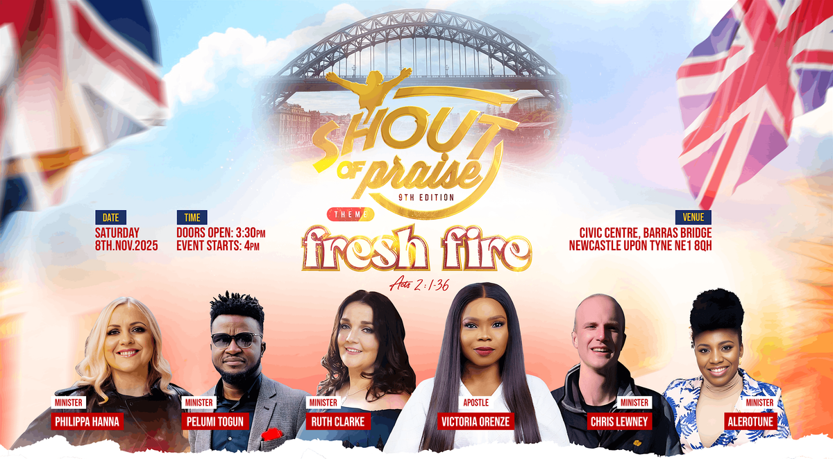Join us for Shout of Praise 2025, themed “Fresh Fire”, on Saturday 8th November 2025 at the Civic Centre, Newcastle Upon Tyne. Doors open from 15:30 GMT. Get ready for a powerful evening of praise, worship, and prayer. This is more than just an event; it’s a moment of revival where God’s fire is poured out and lives are forever changed.