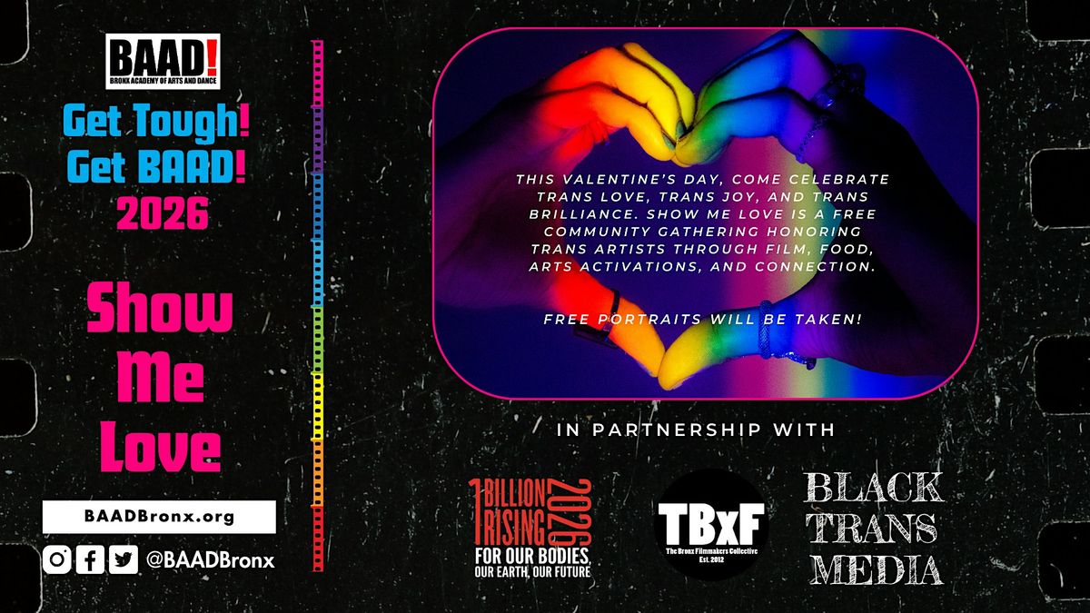 This Valentine’s Day, come celebrate trans love, trans joy, and trans brilliance. Show Me Love is a free community gathering honoring trans artists through film, food, portraits, arts activation, and connection. All guests are invited to have their portrait taken, explore our “Where Are Our Bronx Transgender People of Color Who Are Artists and Out” gallery, enjoy hors d’oeuvres, and gather in a space rooted in affirmation and celebration. The evening also features film screenings by trans filmmakers, creating space to witness, uplift, and love our community out loud and together! We’ll end the night dancing!