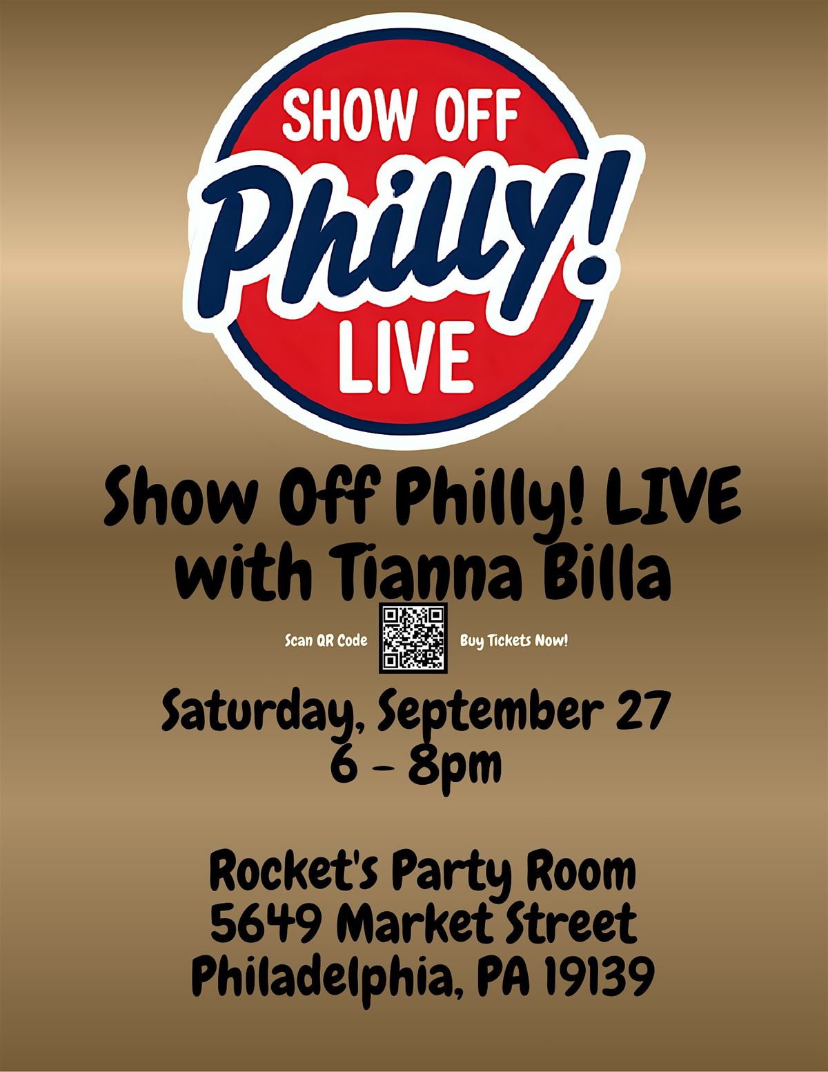 Welcome to Show Off Philly! LIVE with Tianna Billa! Join us for an exciting in-person event at Rocket's Party Room. Get ready to experience an unforgettable evening filled with poetry, music, laughter, and fun. Tianna Billa will be showcasing her incredible talent live on stage. Get Spoken Word Poetry & Soulful R&B! Don't miss out on this one-of-a-kind event! Grab your friends and come on down to Show Off Philly! LIVE with Tianna Billa at Rocket's Party Room.