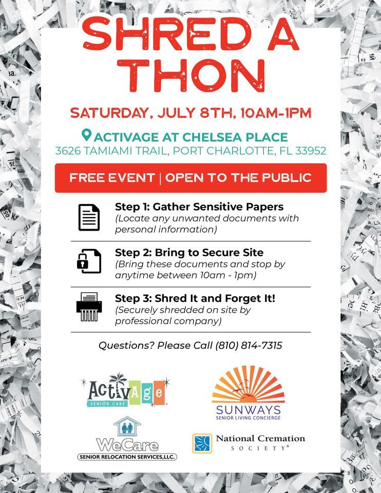 We cordially invite all community members to participate in the Shred-A-Thon, scheduled for Saturday, July 8th, from 10:00 AM to 1:00 PM at ActivAge at Chelsea Place.