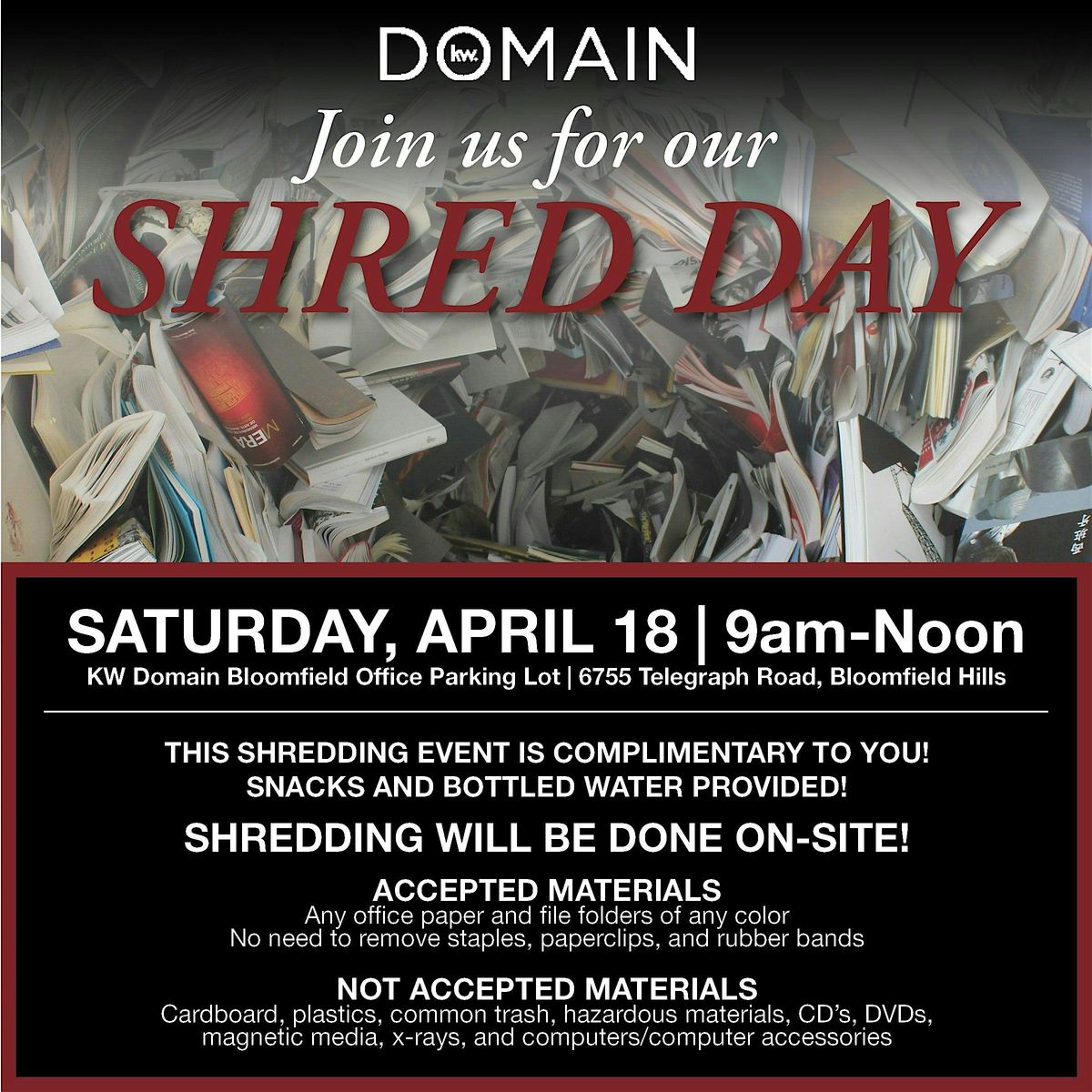 Join me at our KWD Bloomfield Parking Lot and get those confidential papers and files shredded to bits!