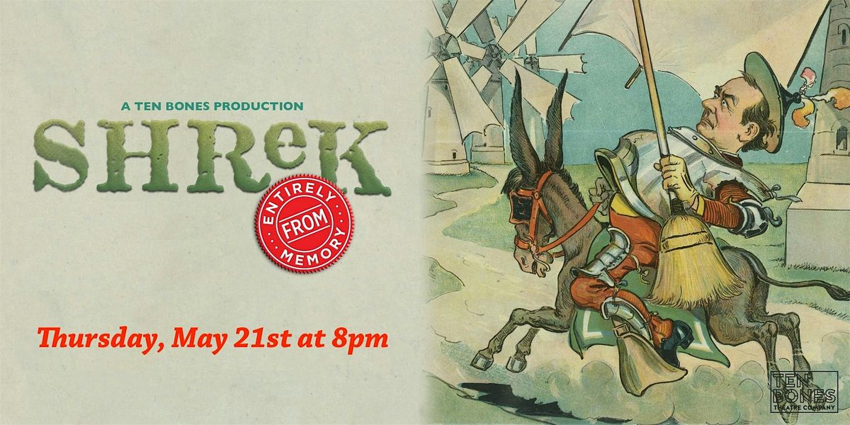 Ten Bones Theatre Company (www.tenbones.org) is thrilled to be back at littlefield for our next installment of the Entirely From Memory (www.entirelyfrommemory.com) series! Performers will attempt (and most likely fail) to recreate "Shrek", without the aid of scripts, rehearsals, or sobriety. All they will have will be their memory, a recent viewing of the films, and a lot of wigs. How certain are we that they'll succeed? So certain that we're making it harder for them.-Performers won't know what role they are playing until they get onstage.-Performers must incorporate lines written by the audience.-Performers must incorporate any sound effect played by the tech booth.