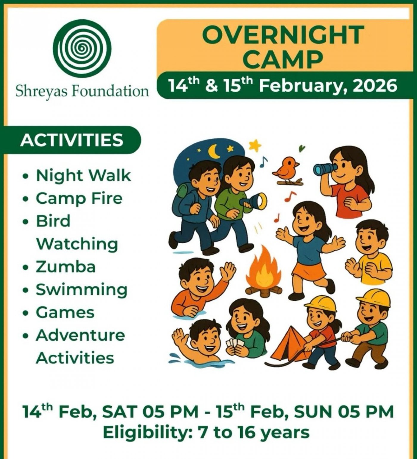Shreyas Foundation is organizing Overnight camp from 14 February Saturday 5 pm to 15th February Sunday 5pm at campus.