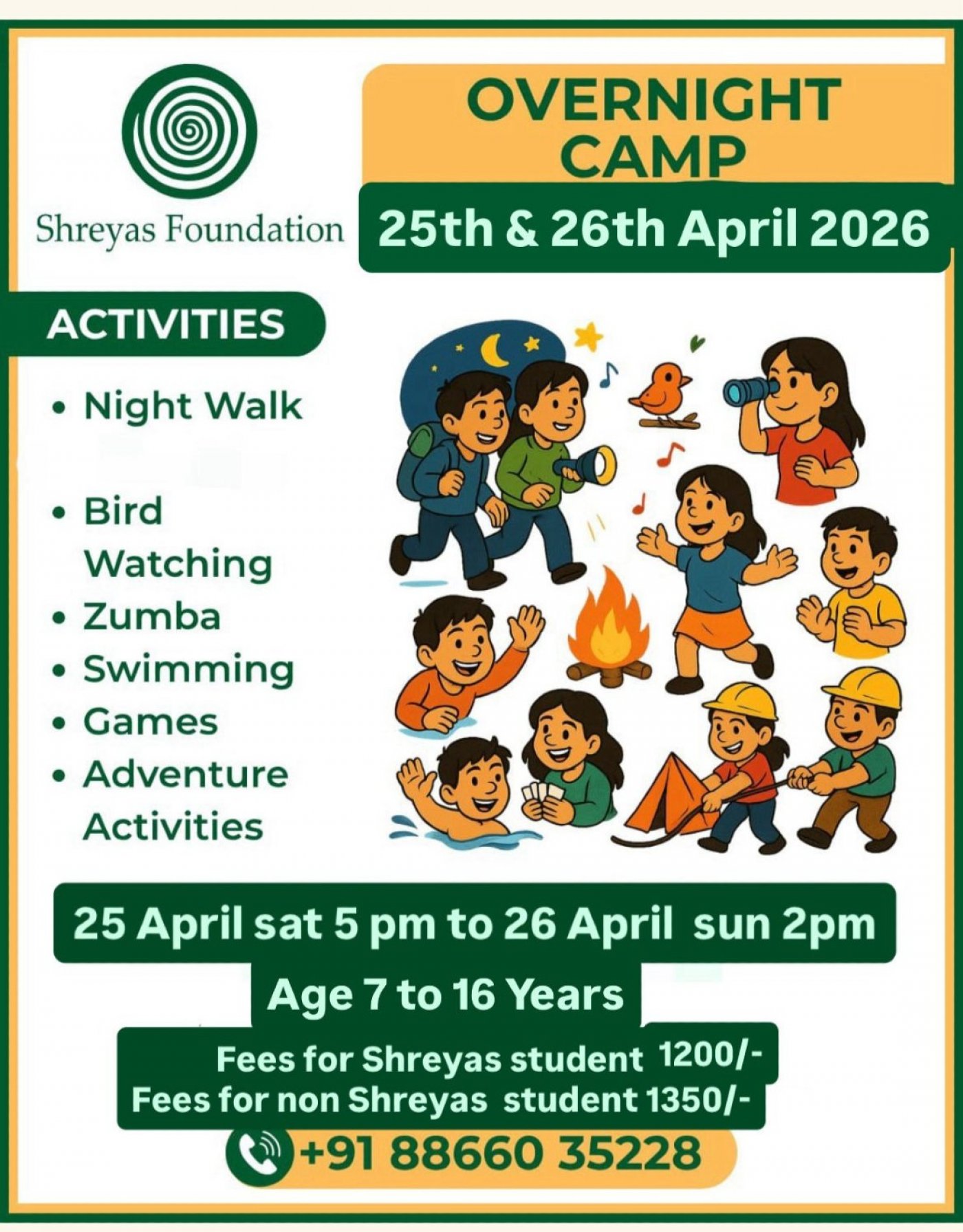 Shreyas Foundation is organizing Overnight camp from 25th April Saturday 5 pm to 26th April Sunday 2pm at campus.