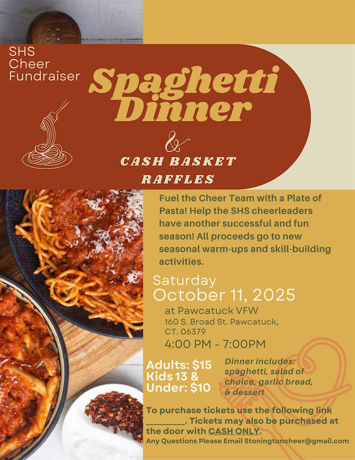 Join us for an evening of delicious spaghetti, exciting raffle prizes, and high school cheer spirit!About this Event