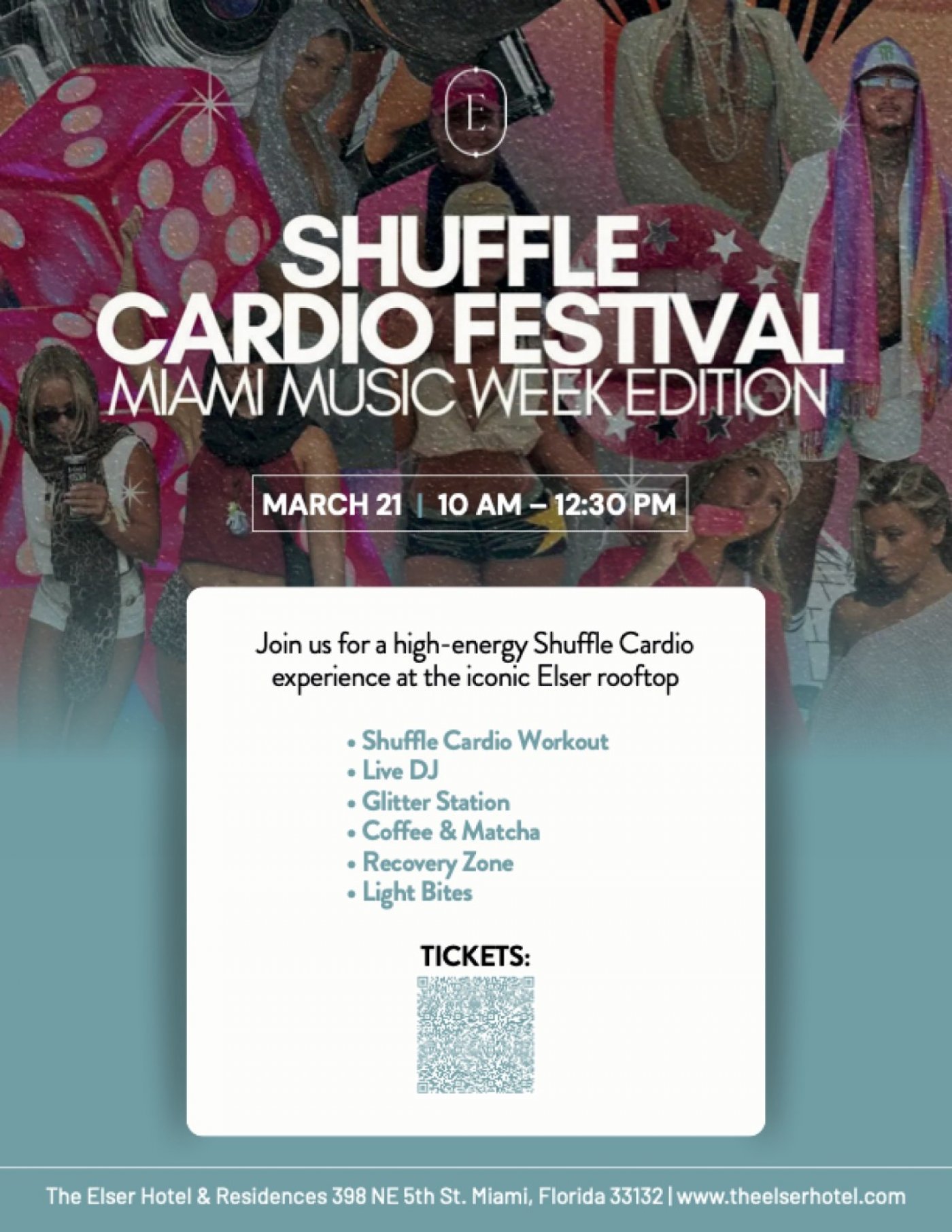 Shuffle Lab brings its signature dance-meets-wellness experience to The Elser Hotel & Residences for a special Miami Music Week edition on Saturday, March 21 from 10 a.m. to 12:30 p.m. The cardio festival features a beginner-friendly shuffle class (no experience needed), a glitter station, live DJ performances and beverage offerings like coffee and matcha. After the shuffle, attendees are invited to experience a recovery zone with lymphatic drainage, as well as 15% off lunch at The Elser’s Bayview Rooftop Bar & Kitchen. Tickets can be found https://www.sweatpals.com/event/shuffle-cardio-miami-music-week-edition?utm_source=host_4a4c127e-a330-4138-be78-00cf5782c28b&utm_medium=shared_link&utm_campaign=event_share_8ca9246d-1d12-497a-9d1d-64f2efe9aa07