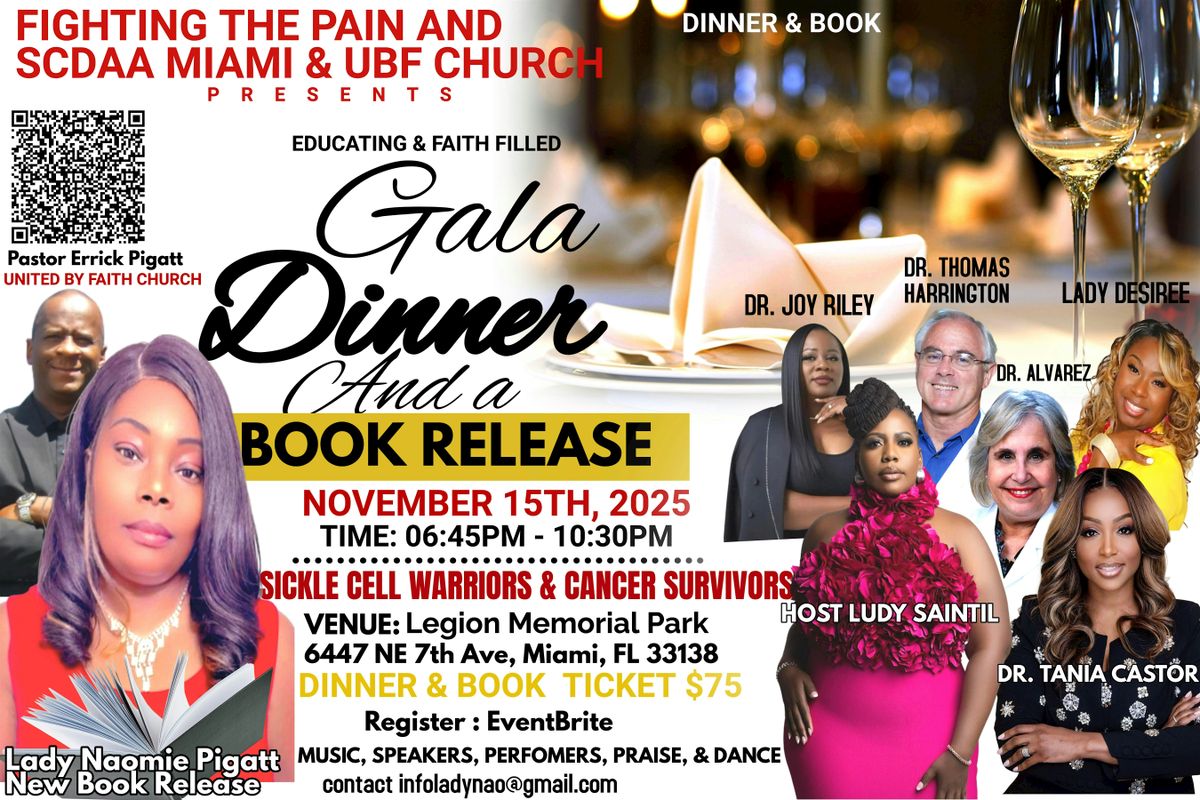 Join Fighting the Pain, United By Faith Church and SCDAA Miami, for a SCD and Chronic Pain Christian Faith Dinner Experience. This will be unforgettable Gala & Lady Naomie New Book Release. Special Guest, Ludy Santil Host, Dr.Tania Castor for Mental Health, Dr. Thomas Harrington Director of Jackson & UM Adult Sickle Cell Program, Lady Desiree Hall froM Radio WMBM 1490, Sabrina Darling and much more. The Gala Dinner Experience and Book Release, will be an evening of support, connection, celebration, and fellowship. This unforgettable evening of lady Naomie Book Release is designed to bring those living with Sickle Cell, Cancer surviors, Lupus, those lliving with Chronic Pain, and any one want to support them a evening of inspiring and motivating words. Sickle cell warriors, families, Advcotes, Medical Profeffionals, all together in a warm and faith-filled atmosphere. Lady Naomie will be sharing her journey, her story of battling sickle cell and how God made her pain to purpose. So whether you’re a single adult sickle cell warrior seeking community or a Cancer survior, or a Caregiver looking to encourage you and your fammily, this event offers a warm atmosphere with uplifting conversations, a delicious meal, and a faith-centered program. Enjoy a delicious meal, uplifting music, a photoshoot, and heartfelt messages celebrating God’s love and the hope rooted in faith for everthing you go through.