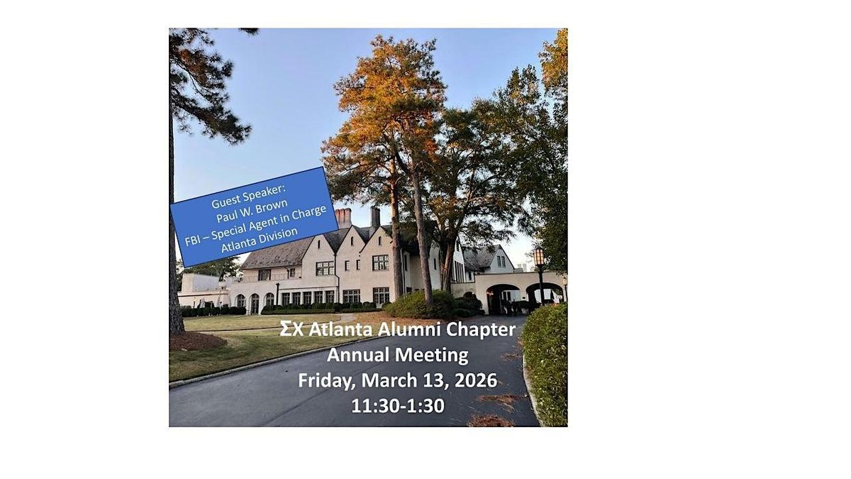 Hey Sigma Chi brothers! Don't miss out on the chance to reconnect and reminisce at the Sigma Chi Atlanta Alumni Annual Meeting. This in-person gathering features speaker Brother Paul Brown who is the Special Agent in Charge of the Atlanta Division of the FBI. Lunch to be served promptly at 12:00.