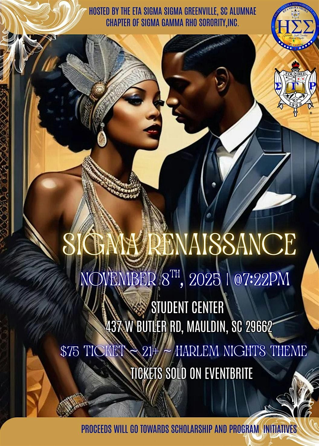 Welcome to SIGMA RENAISSANCE! Join us for a night filled with excitement, creativity, and innovation. This in-person event will be held at 437 W Butler Rd, Mauldin, SC 29662. Get ready to immerse yourself in a renaissance of ideas, inspiration, and connections. Don't miss out on this opportunity to be a part of something extraordinary. Mark your calendars and get ready to experience the renaissance like never before! This event will fund community scholarships and other chapter inititives.
