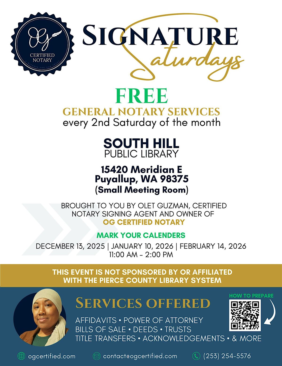 As a way to connect with and give back to the community, OG Certified Notary is providing free notary services at the South Hill Public Library for your important documents, such as: