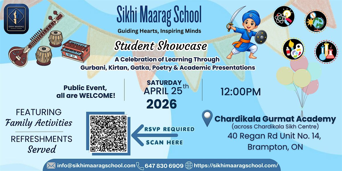 A public event where Sikhi Maarag students showcase their learning through Kirtan, Gatka, poetry, Gurbani recitation, role play, and academic projects. Join us on April 25th to support and celebrate their journey.