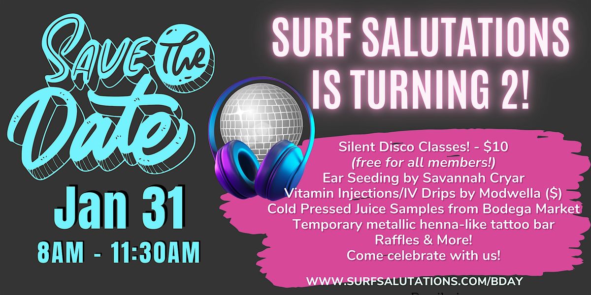 We’ve got an exciting day planned with fun activities, special classes, and giveaways to thank you for an amazing year of movement and community! Free to come by for the wellness activations but classes are $10. Sign up at www.surfsalutations.com/bday