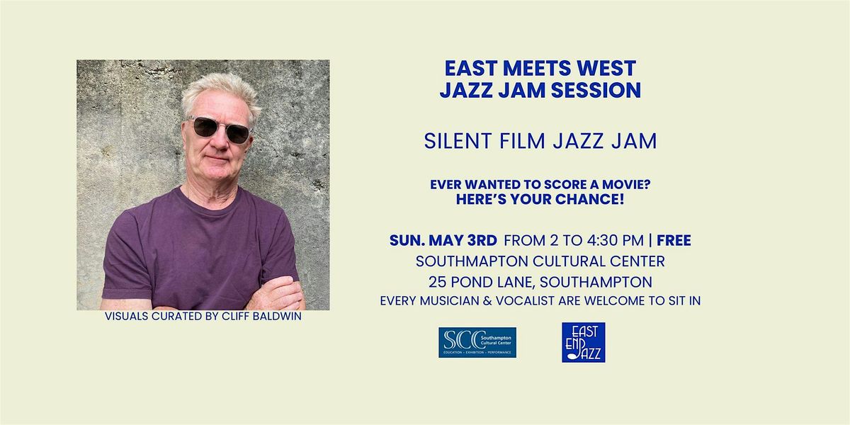 East End Jazz is thrilled to announce the grand finale of its current season: a special "Live Film / Live Jazz" edition of the "East Meets West Jazz Jam Session" on Sunday, May 3rd, 2026 from 2 to 4:30PM at the Auditorium at SCC on 25 Pond Lane, SH. Admission Free. This season closer features a high-concept collaboration with renowned multimedia artist Cliff Baldwin, who has curated a series of silent film clips specifically to be "scored" in real-time by the community.