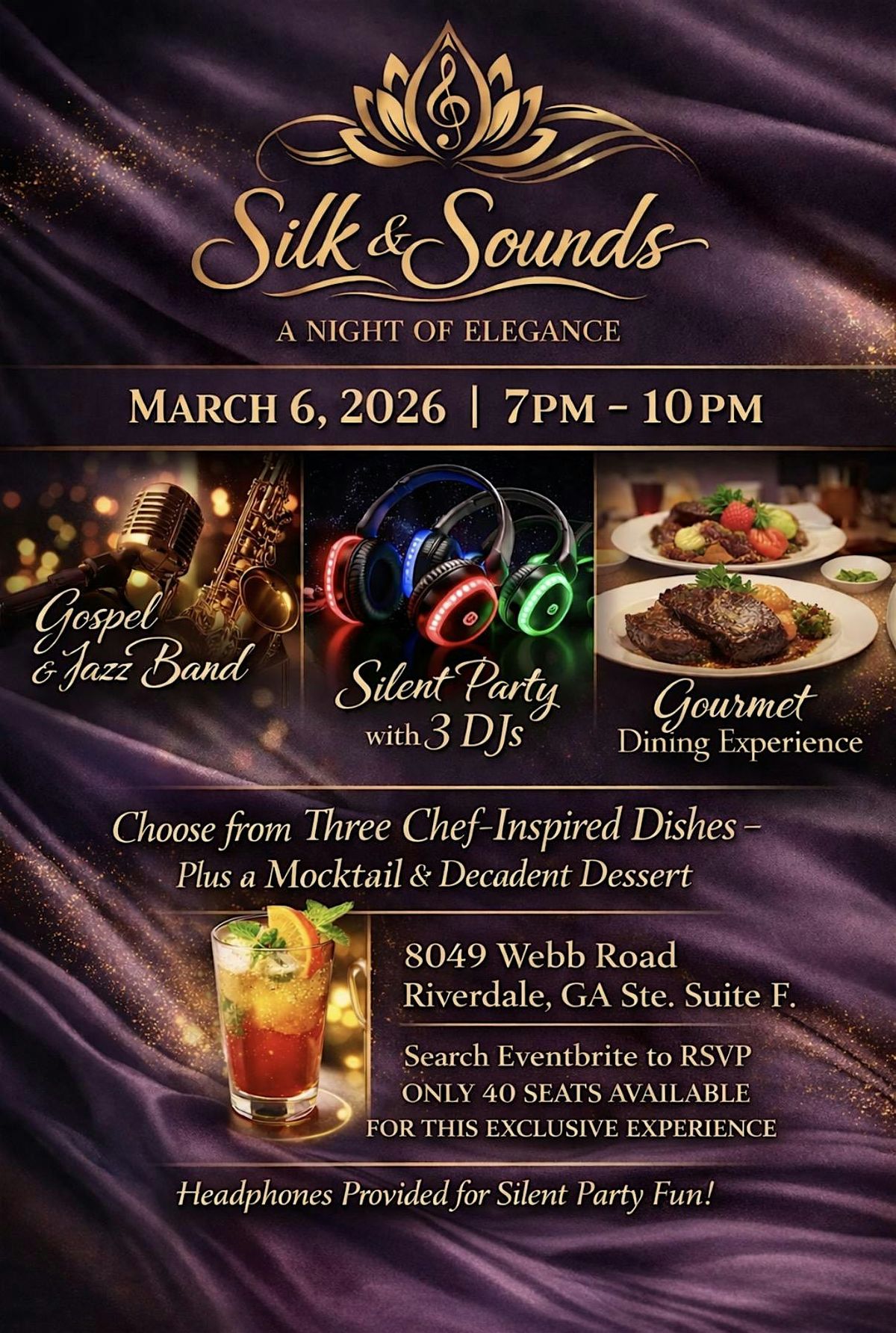 Get ready for an unforgettable evening! Silk and Sounds brings you a night filled with smooth vibes, classy tunes, and an atmosphere dripping with style. Join us in person for a celebration where elegance meets rhythm. Dress to impress, bring your best moves, and let’s make memories under the spotlight. Don’t miss out on this chic gathering designed to dazzle your senses and lift your spirit!