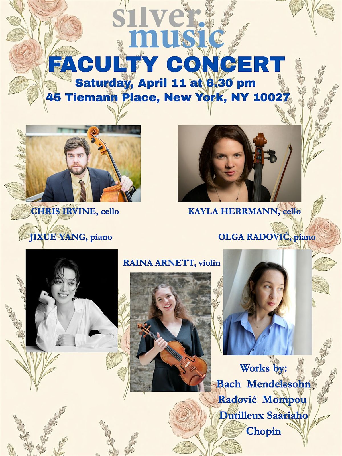 We invite you to attend a Silver Music Faculty on Saturday, April 11th at 6:30pm at our Tiemann location. The 60 minute performance will include a variety of short works that will be fun and engaging for students and adults. You will hear works by Chopin, Bach, Dutilleux, Radovic, Mompou, Saariaho and Mendelssohn
