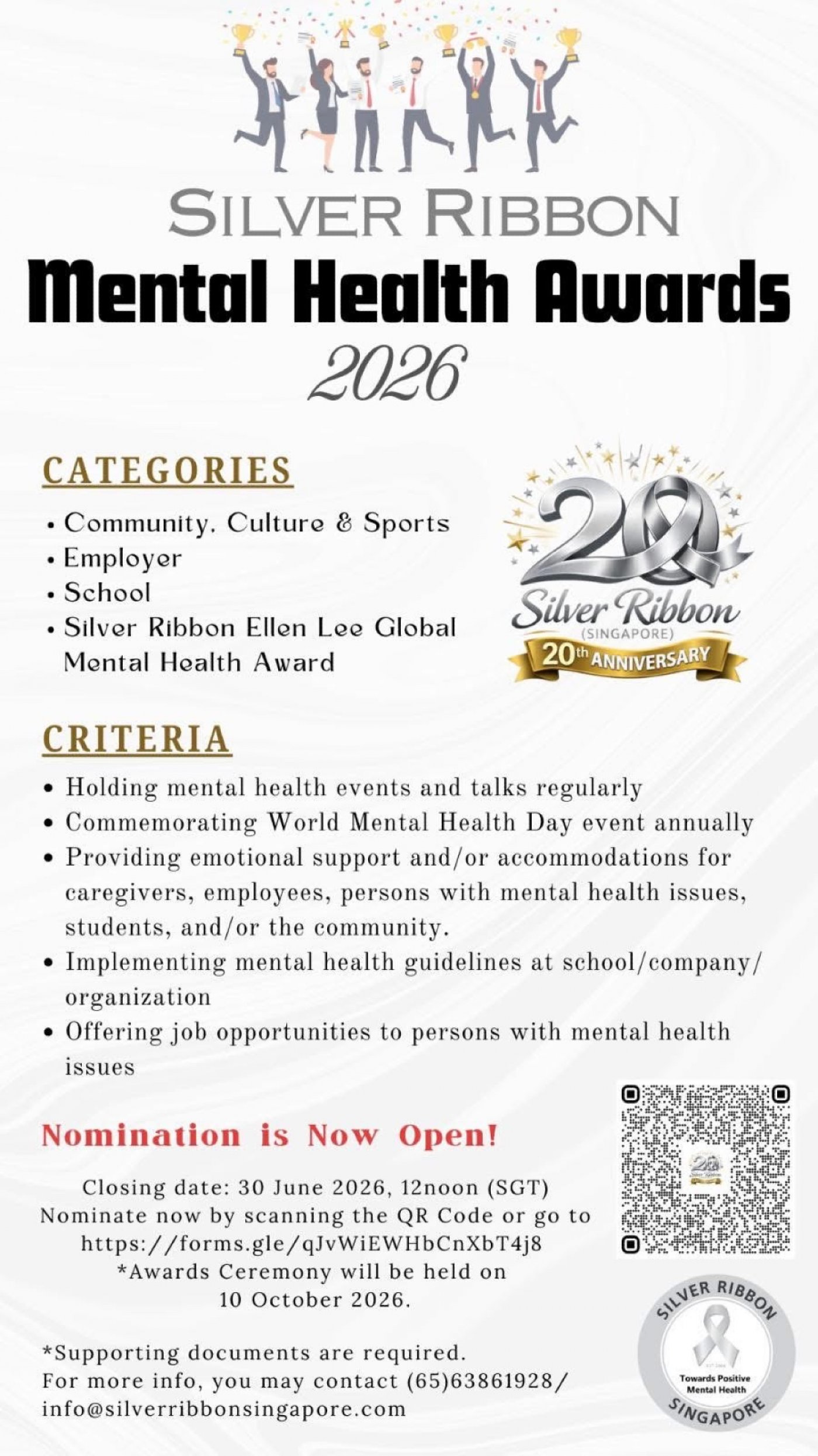 Silver Ribbon Mental Health Awards 2026 is now open for nominations, recognising individuals and organisations that have made significant contributions to advancing mental health awareness, advocacy, and support.