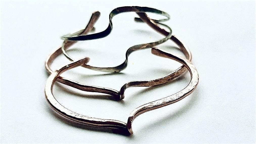 In this Level 2 bracelet class students will work with copper and silver to create 2 minimalist cuff bracelets. In class we’ll cover sizing, annealing, forming and hand forging heavier gauge wire with a vice, chasing hammer and anvil. This bracelet is easy to wear and great for stacking