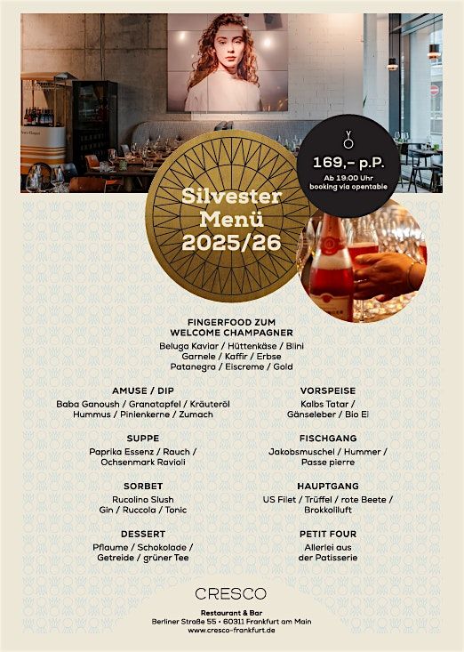 Wir freuen uns, den Jahreswechsel gemeinsam mit Ihnen in stimmiger Atmosphäre bei einem ausgewogenen Menü und einem Glas Welcome-Champagner zu feiern. Ab 19:00 Uhr heißen wir Sie in unserem Restaurant in der Frankfurter Innenstadt herzlich willkommen und begrüßen Sie mit Champagner und Fingerfood. Ab ca. 19:30 Uhr wird ein acht-Gänge Menü serviert