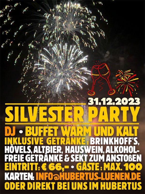 DJ, Buffet Warm/Kalt, Brinkhoff's, Hövels, Altbier, Hauswein,alkoholfreie Getränke & Sekt zum Anstoßen sind inklusive. Eintritt 66,00€ Max 100 Gäste.Tickets: info@hubertus-luenen oder bei uns im Hubertus