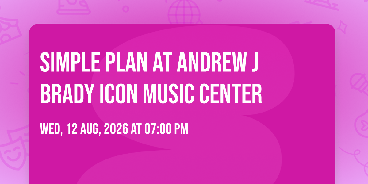 ๐ Journey into wonder at Simple Plan at Andrew J Brady ICON Music Center, where extraordinary experiences await around every corner! ๐๏ธ Set against the backdrop of Andrew J Brady ICON Music Center in dynamic Cincinnati, OH, this event promises to exceed all expectations. ๐ Join us on August 12th, 2026 at 07:00 PM for a celebration that combines innovation, entertainment, and community spirit in perfect harmony. โจ There will be an atmosphere where memories are made and stories come alive, ensuring every guest experiences something truly remarkable. ๐ This is more than just an event; it's a journey into the extraordinary!