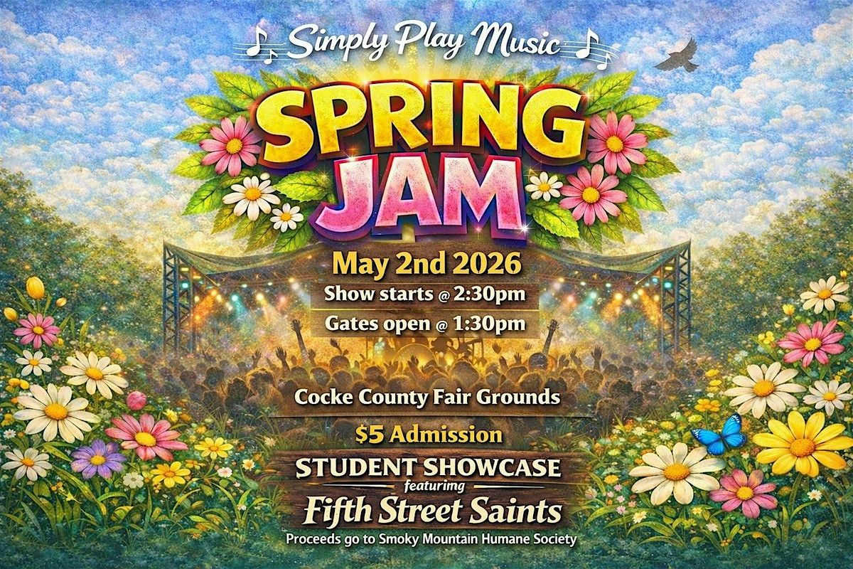 Get ready to vibe at the Simply Play Music Spring Jam Student Showcase! This is your chance to catch some amazing performances from our talented students, all happening in person. Followed by a special performance by Fifth Street Saints. Whether you’re a music lover or just looking for a fun outing, this event’s got something special for everyone.. Food trucks and vendors will be onsite for some great food. Also a basket raffle from the Isaiah house. Come join us for a day full of rhythm, energy, and good times! Watch the students of Simply Play Music show off their skills they have been learning this year! Gates open at 1:30, Student Showcase starts at 2:30pm. Fifth Street Saints go on at 6pm. All proceeds will go to the Smoky Mountain Humane Society!
