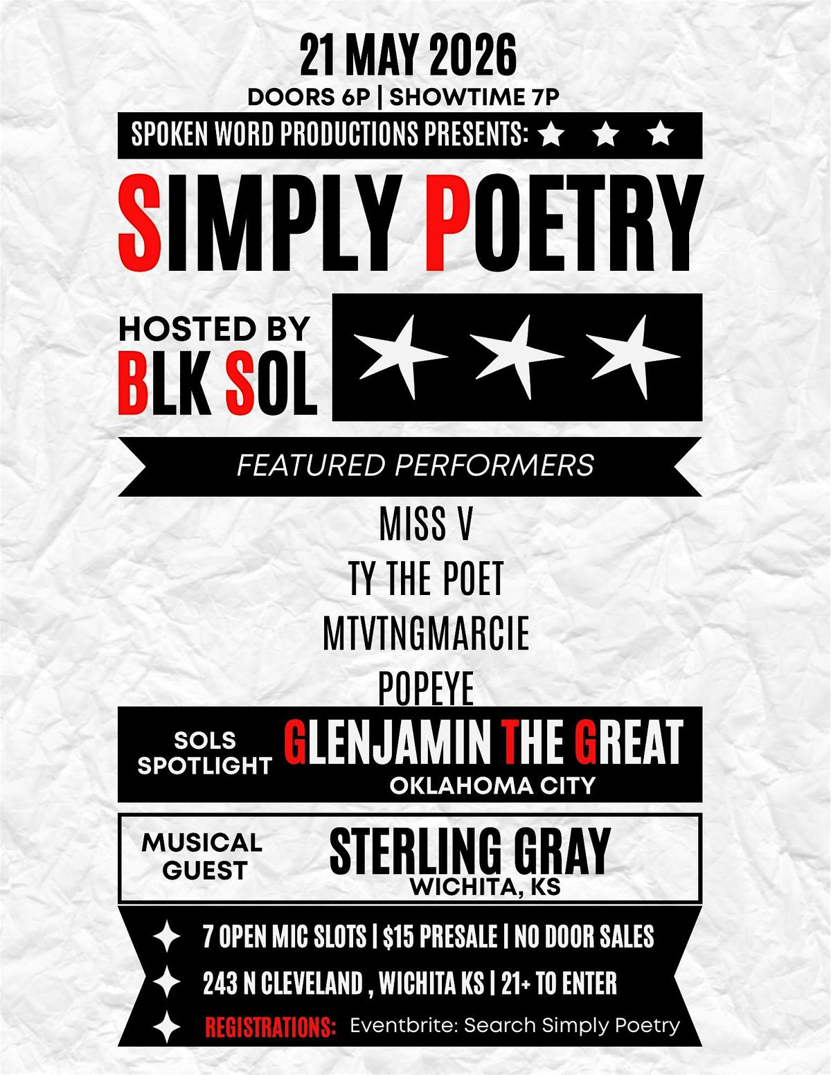 Get ready for a night full of words and vibes at Simply Poetry featuring the amazing Glenjamin the Great! If you’re in Wichita, KS, come through for some authentic, heartfelt performances. This one’s in person, so bring your energy and love for poetry. Whether you’re a fan or just curious, it’s gonna be a chill, inspiring evening you won’t wanna miss!