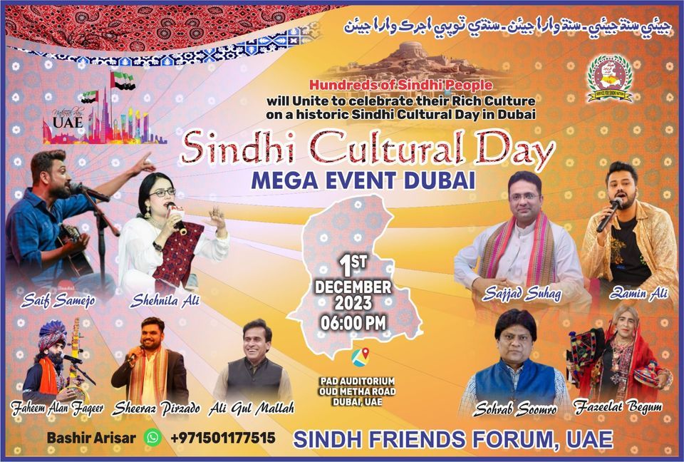 1 ڊسمبر 2023 دبئي ۾ سنڌي ثقافتي ڏھاڙو!جتي سنڌ کان ٻاھر ھڪ ننڍي سنڌ گڏ ٿيندي... سنڌ ۽ سنڌي ثقافت سان پيار ۽ پريت جو اظھار ٿيندو، جنھن ۾ سنڌ جا سريلا فنڪار پنھنجي سُرن جون محفلون مچائيندا ۽ سنڌ جا مزاحيھ فنڪار مُرڪون ۽ ٽھڪ وکيريندا.