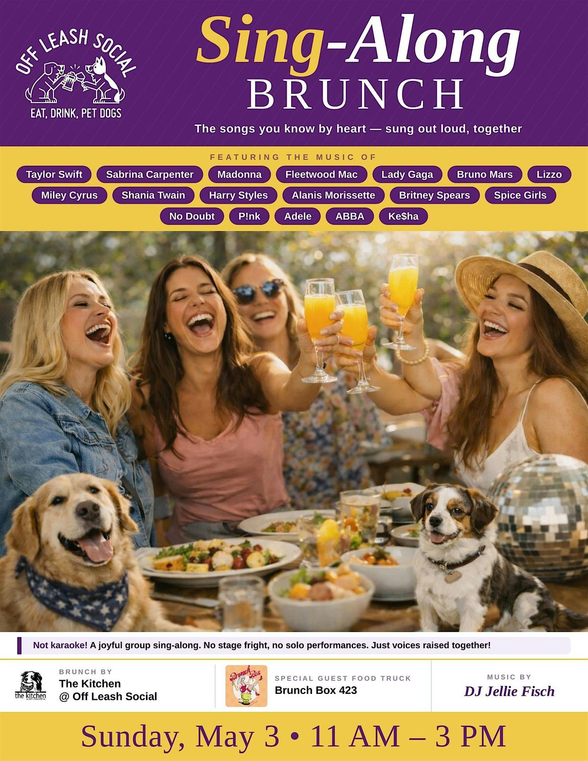 Sing-Along Brunch at Off Leash SocialJoin us for great vibes, great music, and an unforgettable brunch experience! This isn’t karaoke—no stage, no solos, no pressure. Just all the songs you know by heart, sung together with a crowd that’s ready to have fun.