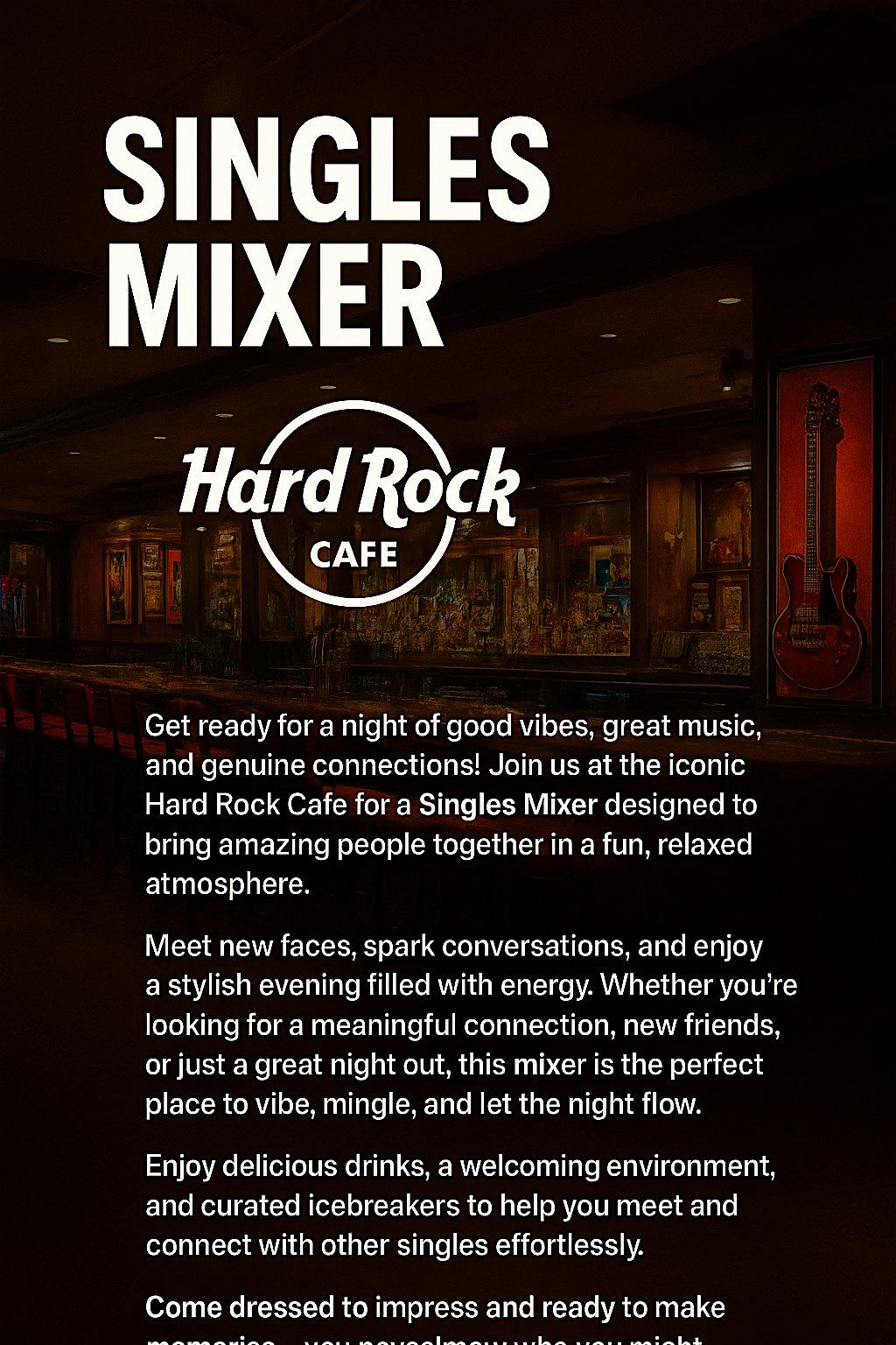 Meet new faces, spark conversations, and enjoy a stylish evening filled with energy. Whether you’re looking for a meaningful connection, new friends, or just a great night out, this mixer is the perfect place to vibe, mingle, and let the night flow.a welcoming environment, and curated icebreakers to help you meet and connect with other singles effortlessly. Come dressed to impress and ready to make memories you never know who you might meet.This is your night. Come mix, match, and make a connection at Hard Rock Café.Where is it happening?