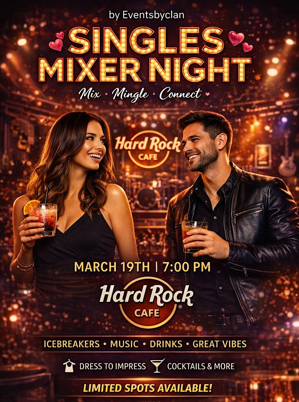 Looking to meet new people in a fun, relaxed, and social setting? Join us for a Singles Mixer at Hard Rock Cafe on March 19th at 7:00 PM.