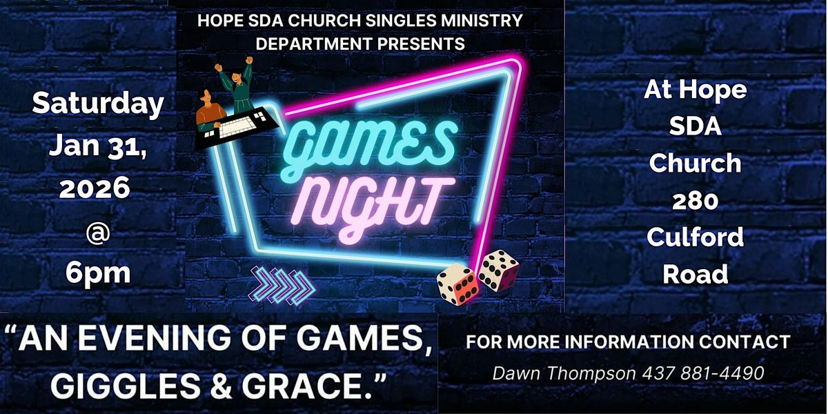 Welcome to Games Night at Hope SDA Church! Join us on January 31, 2026 at 6:00 PM for a fun-filled evening of games and laughter. Whether you're a board game enthusiast or just looking for a good time, this event is perfect for singles.
