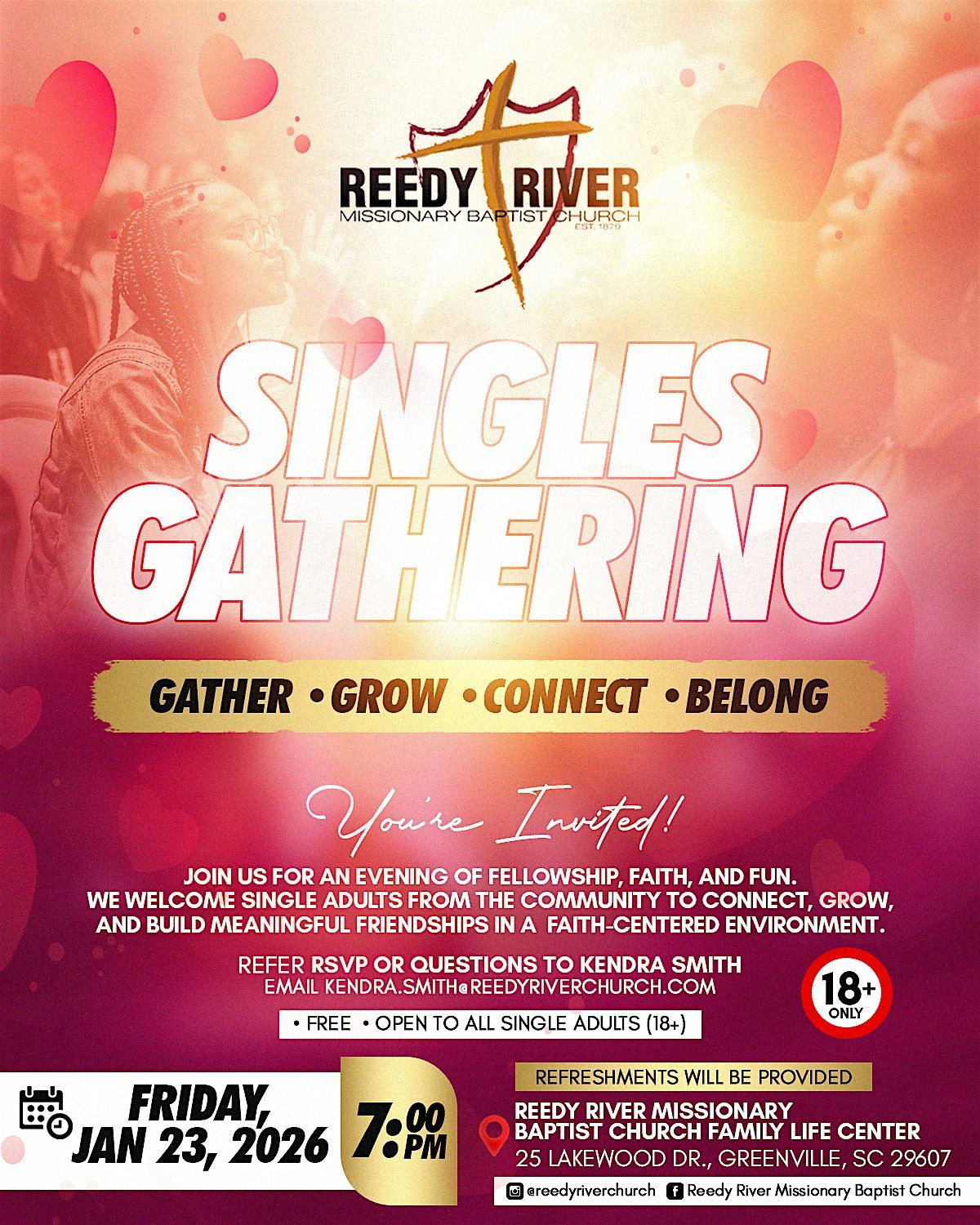 Join Reedy River Missionary Baptist Church for an evening of fellowship, faith, and fun designed specifically for single adults in our community. Whether you're new to the area or looking to build meaningful friendships in a faith-centered environment, this gathering is for you!