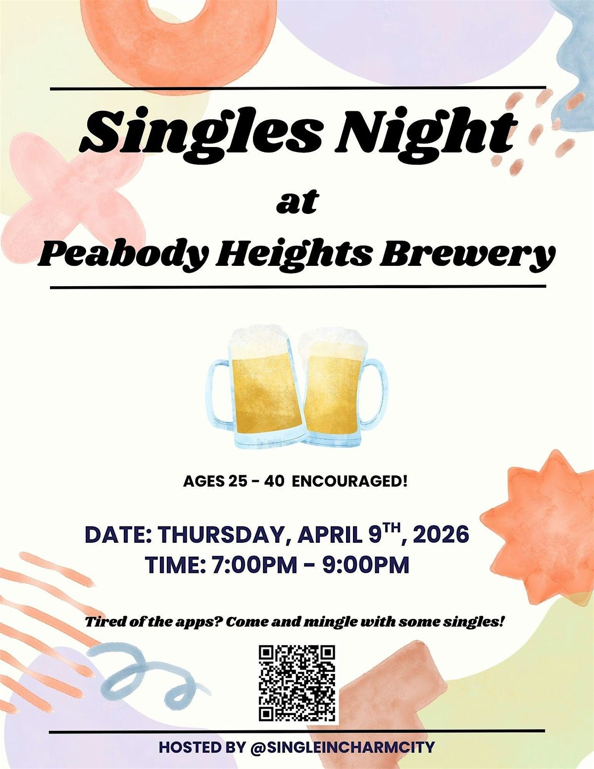 Welcome to Singles Night! Join us at Peabody Heights Brewery for a fun evening of mingling and meeting new people. Feel free to bring your single and taken friends - we will have icebreakers and wristbands to designate singles and wingpeople. Grab a drink, strike up a conversation, and see what the night may bring!