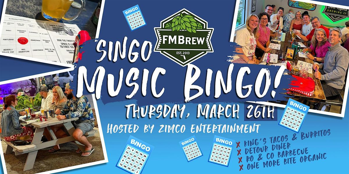 Join us Thursday, March 26 at 7pm for a night of SINGO Music Bingo, hosted by ZIMCO Entertainment, at FMBrew! It’s like Name That Tune meets Bingo — listen to the song clips, mark your card, and sing along while you play!