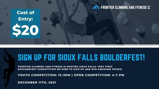 Announcing Sioux Falls BoulderFest!Please join us for Frontier's first climbing competition! We are excited to be hosting our first bouldering competition Saturday December 11th. The cost of entry is $20 plus taxes and fees. You can sign up through the link below: